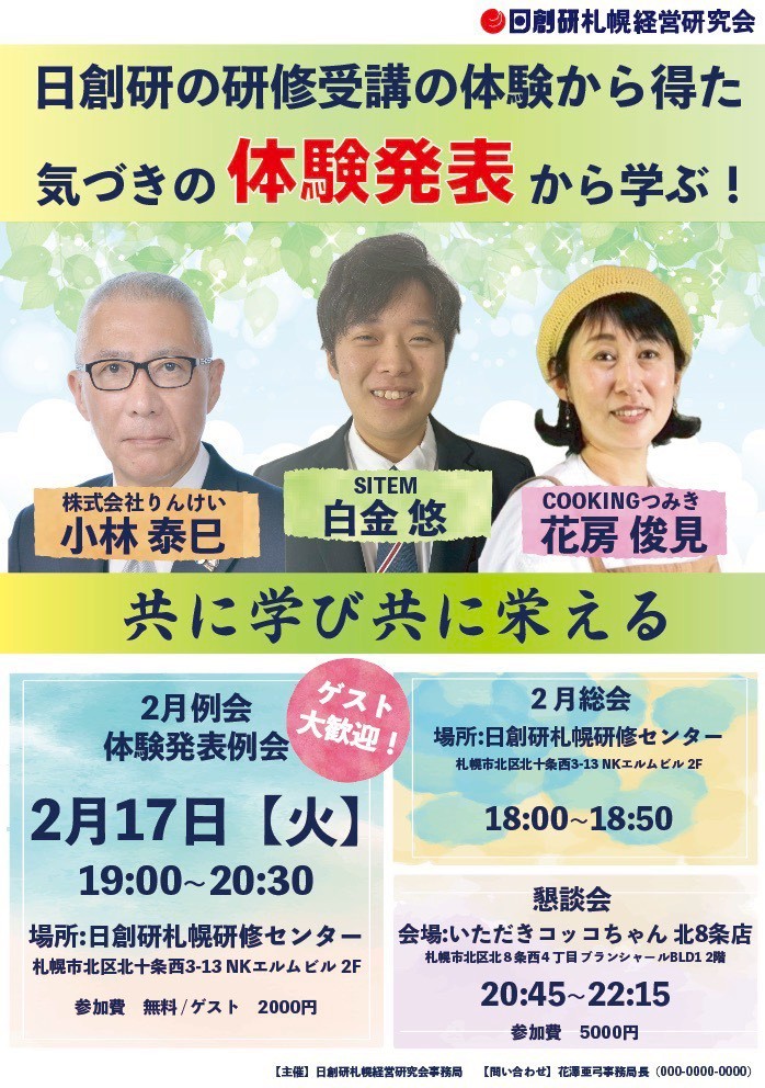 研修受講者の「気づき」を共有する体験発表例会(2月例会)のご案内です。